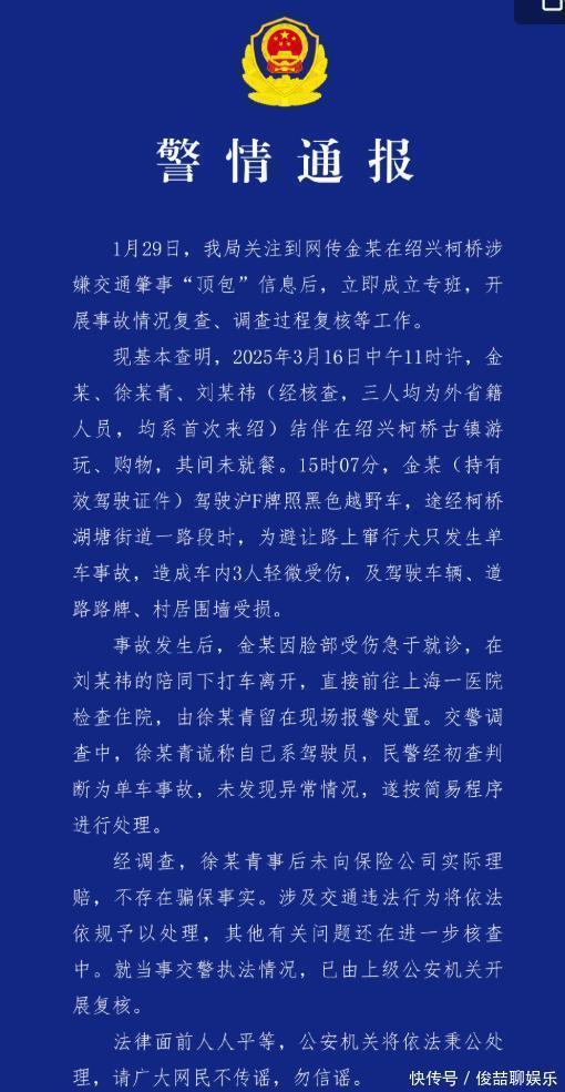 刚刚,警方发布通报:1月29日,我局关注到网传金某在绍兴柯桥涉嫌交通肇事“顶包”信息后,立即成立专班,开展事故情况复查、调查过程复核等工作。现基本查明,2025年3月16日中午11时许,金某、徐某青、刘某祎(经核查,三人均为外省籍人员,均系首次来绍)结伴在绍兴柯桥古镇游玩、购物,其间未就餐。15时07分,金某(持有效驾驶证件)驾驶沪F牌照黑色越野车,途经柯桥湖塘街道一路段时,为避让路上窜行犬只发生单车事故,造成车内3人轻微受伤,及驾驶车辆、道路路牌、村居围墙受损。事故发生后,金某因脸部受伤急于就诊,在刘某祎的陪同下打车离开,直接前往上海一医院检查住院,由徐某青留在现场报警处置。交警调查中,徐某青谎称自己系驾驶员,民警经初查判断为单车事故,未发现异常情况,遂按简易程序进行处理。经调查,徐某青事后未向保险公司实际理赔,不存在骗保事实。涉及交通违法行为将依法依规予以处理,其他有关问题还在进一步核查中。就当事交警执法情况,已由上级公安机关开展复核。法律面前人人平等,公安机关将依法秉公处理,请广大网民不传谣,勿信谣。
