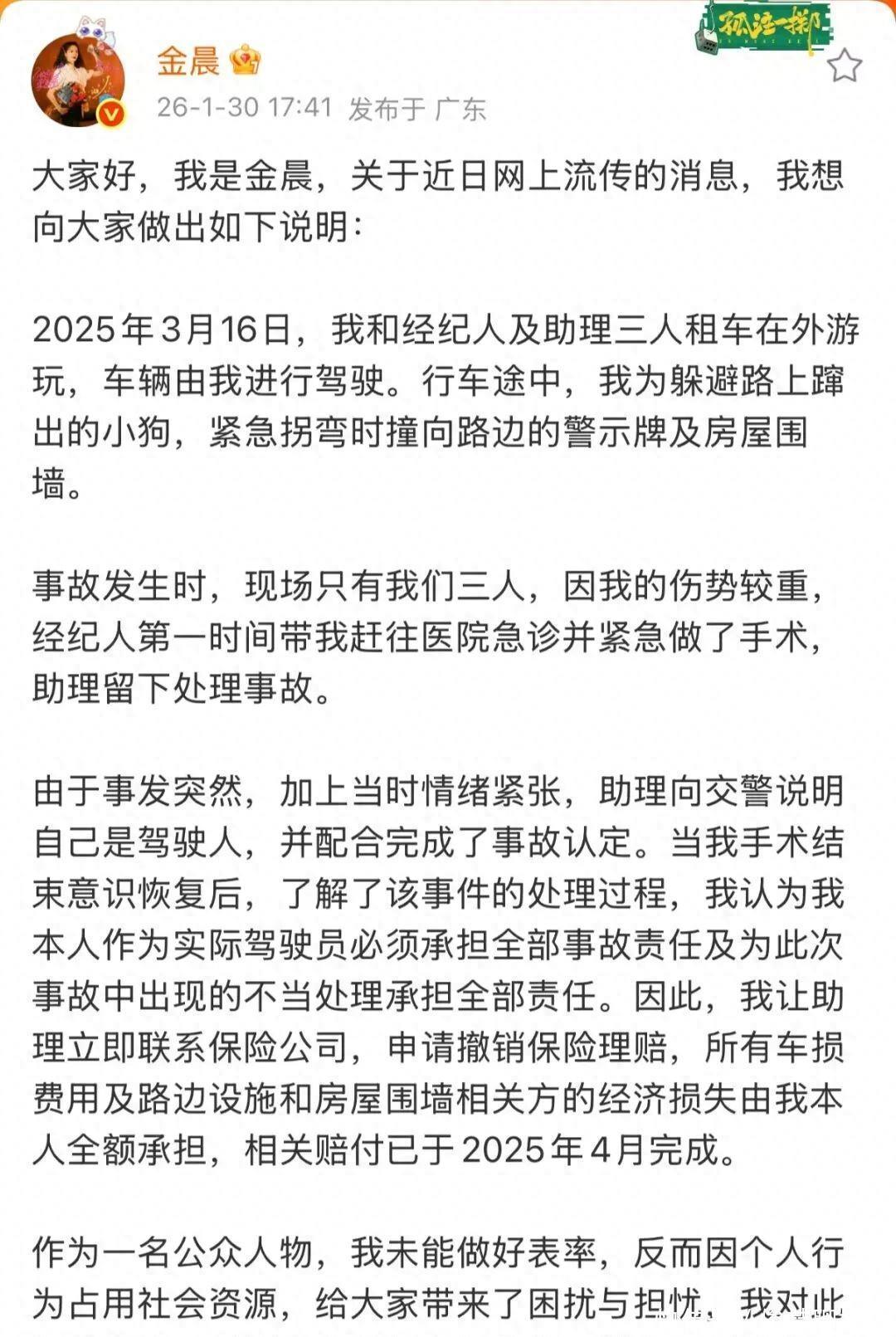 刚刚,金晨发文,详细解释此次交通事故的前因后果:大家好,我是金晨,关于近日网上流传的消息,我想向大家做出如下说明:2025年3月16日,我和经纪人及助理三人租车在外游玩,车辆由我进行驾驶。行车途中,我为躲避路上蹿出的小狗,紧急拐弯时撞向路边的警示牌及房屋围墙。事故发生时,现场只有我们三人,因我的伤势较重,经纪人第一时间带我赶往医院急诊并紧急做了手术,助理留下处理事故。由于事发突然,加上当时情绪紧张,助理向交警说明自己是驾驶人,并配合完成了事故认定。当我手术结束意识恢复后,了解了该事件的处理过程,我认为我本人作为实际驾驶员必须承担全部事故责任及为此次事故中出现的不当处理承担全部责任。因此,我让助理立即联系保险公司,申请撤销保险理赔,所有车损费用及路边设施和房屋围墙相关方的经济损失由我本人全额承担,相关赔付已于2025年4月完成。作为一名公众人物,我未能做好表率,反而因个人行为占用社会资源,给大家带来了困扰与担忧,我对此深感惭愧。感谢大家的关心与监督,我会深刻反省,今后一定更加严格遵守交通法规,谨言慎行,切实承担起应尽的社会责任。再次诚恳致歉。